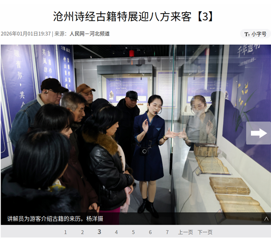 近日,由沧州市文广旅局主办,沧州市博物馆与河间诗经斋承办的“诗韵千年 礼乐迎春——沧州诗经古籍特展”持续引发关注,开展以来游客络绎不绝,观展人数累计约1.4万人次,先后获人民网、河北新闻联播、冀时新闻等媒体播发,成为元旦期间文化惠民的亮眼名片。
