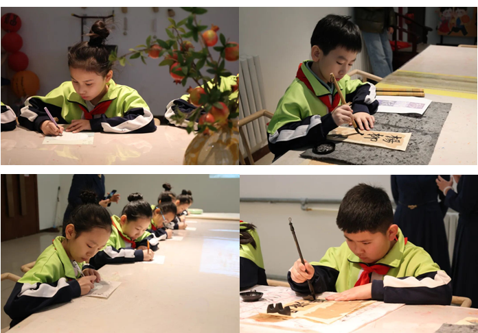 随后,师生代表来到社教活动室,笔墨纸砚早已整齐摆放,一场“诗韵入墨”书法创作体验温情上演。同学们一笔一画临摹《诗经》经典名句,孩子们专注投入,在墨香氤氲中感受汉字与诗歌的双重魅力,将对经典的理解融入笔端,完成了属于自己的《诗经》书法作品。