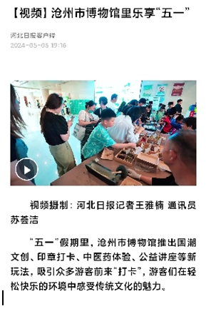 为更好地发挥自身宣传职能,为游客提供最新博物馆资讯、讲好传统文化和沧州故事,沧州市博物馆五一期间在微信公众号、抖音及小红书三个官方平台发布原创图文、视频等信息30余篇,阅读量高达13万余次。此外,中央广电总台国际在线、河北日报等中央及省级媒体对沧州市博物馆五一期间观众参观热潮进行报道。