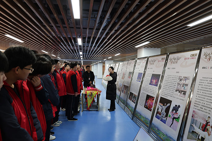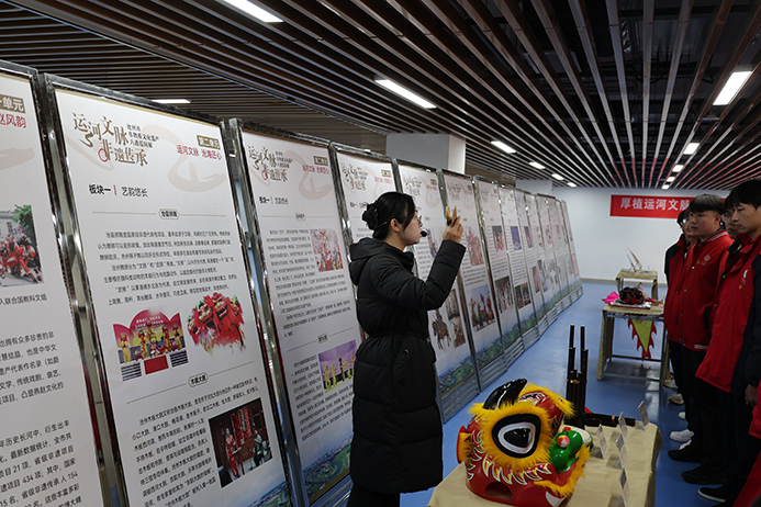 活动现场,沧州非遗主题展板整齐陈列,从大运河漕运催生的传统技艺,到融入百姓生活的武术、杂技、铸造文化,一幅幅图文并茂的展板,如同打开了一部立体的“沧州非遗百科”。我馆讲解员化身“文化导师”,围绕展板内容细致讲解,结合运河故事与非遗背后的民俗渊源,将抽象的文化知识转化为生动的校园课堂,师生们认真聆听,不时驻足交流,加深了对家乡非遗的认知与热爱。