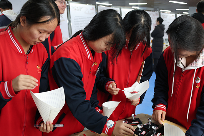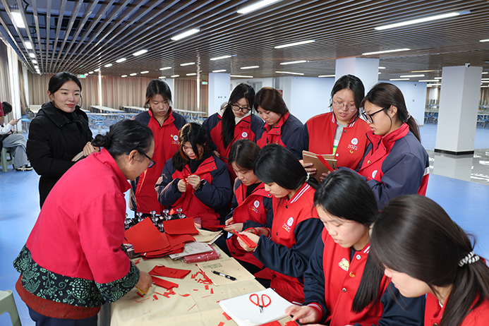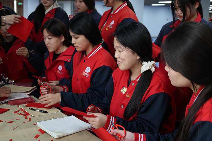 最受师生欢迎的当属非遗体验环节。在剪纸体验区,非遗老师手把手教大家折叠、裁剪,从简单的对称纹样到灵动的生肖造型,在老师的剪刀下,瞬间变成一件件精美的艺术品,同学们耐心尝试,一个个充满创意的剪纸作品陆续诞生;