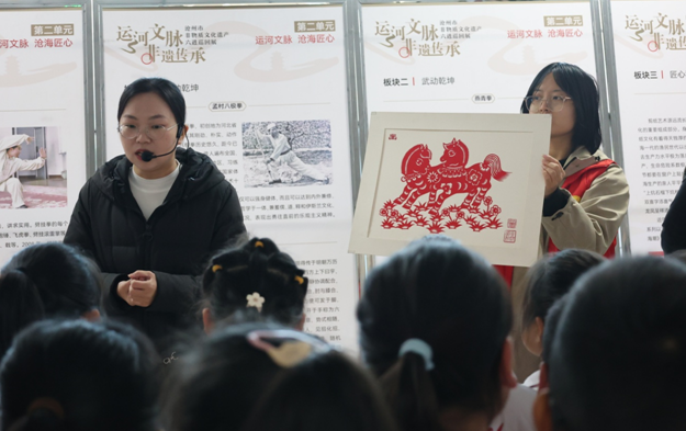 为深入传承中华优秀传统文化,推动非物质文化遗产在青少年群体中薪火相传,12月3日,沧州市博物馆“六进”系列活动走进广州路小学。本次活动以“讲解+体验+打卡”的多元形式分4场有序开展,200余名师生沉浸式领略沧州非遗的独特文化魅力与深厚历史底蕴,在互动参与中播撒文化传承的种子。