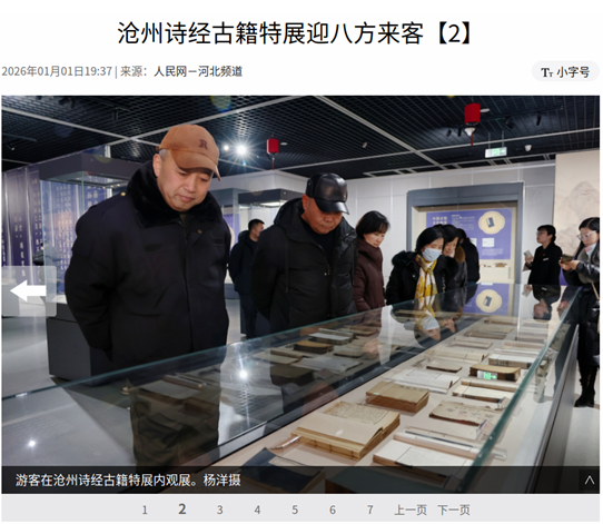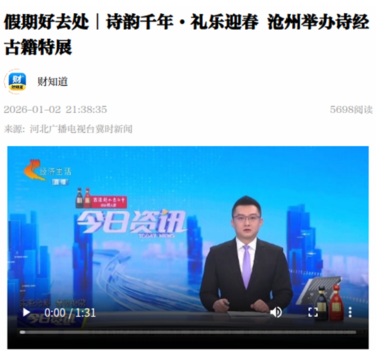 近日,由沧州市文广旅局主办,沧州市博物馆与河间诗经斋承办的“诗韵千年 礼乐迎春——沧州诗经古籍特展”持续引发关注,开展以来游客络绎不绝,观展人数累计约1.4万人次,先后获人民网、河北新闻联播、冀时新闻等媒体播发,成为元旦期间文化惠民的亮眼名片。